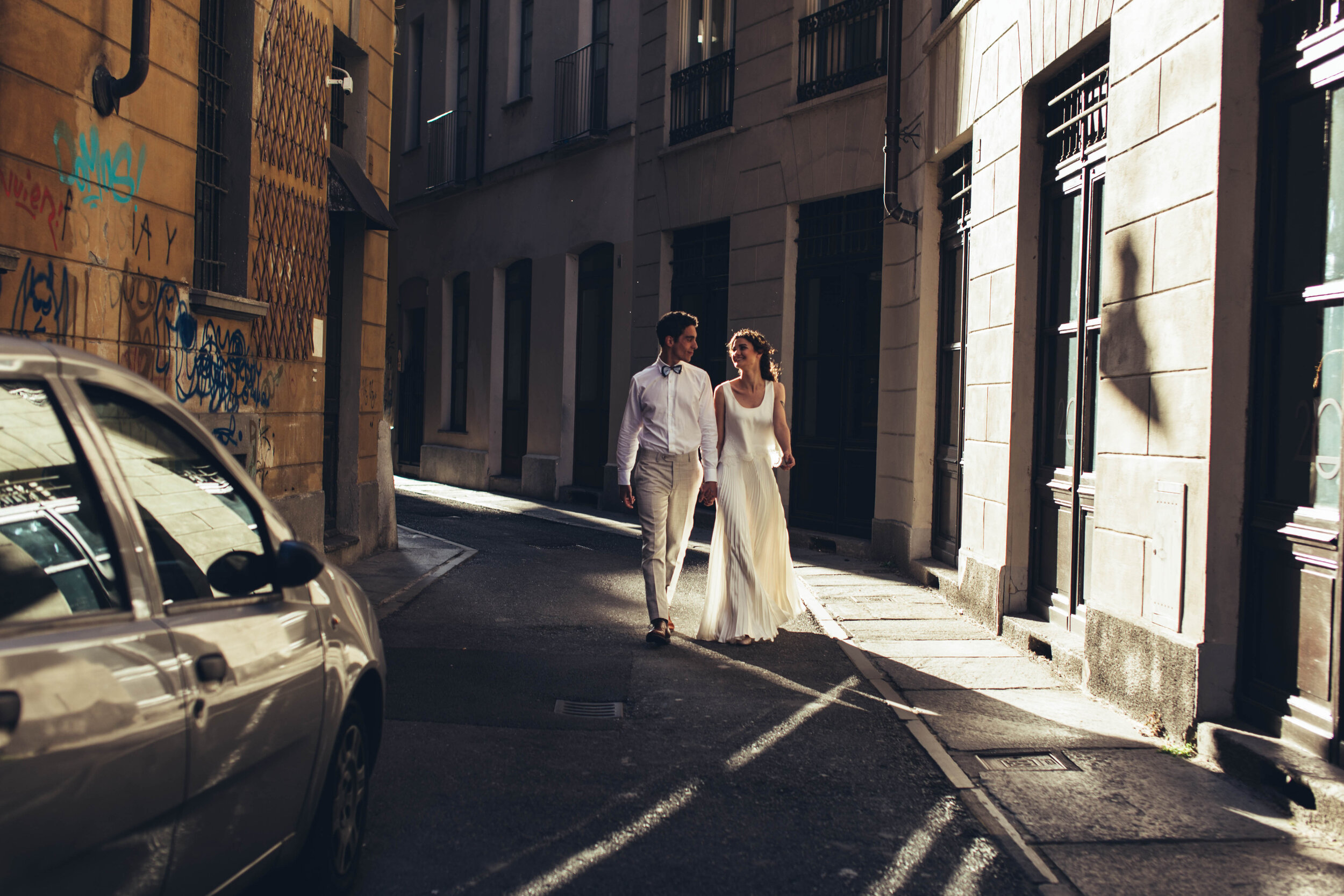 L'idea è nata proprio da una suite grafica che univa la freschezza e il minimalismo della modernità al richiamo classico dell'arte greca antica. Una base di partenza e un mix di stili che ci hanno offerto tanti spunti: l'azzurro pallido delle grafiche, l’oro degli elementi decorativi, gli accenni alla Grecia e l'intento di rappresentare i nostri sposi belli e fieri come dei moderni, ma anche spensierati, vivaci e contemporanei.